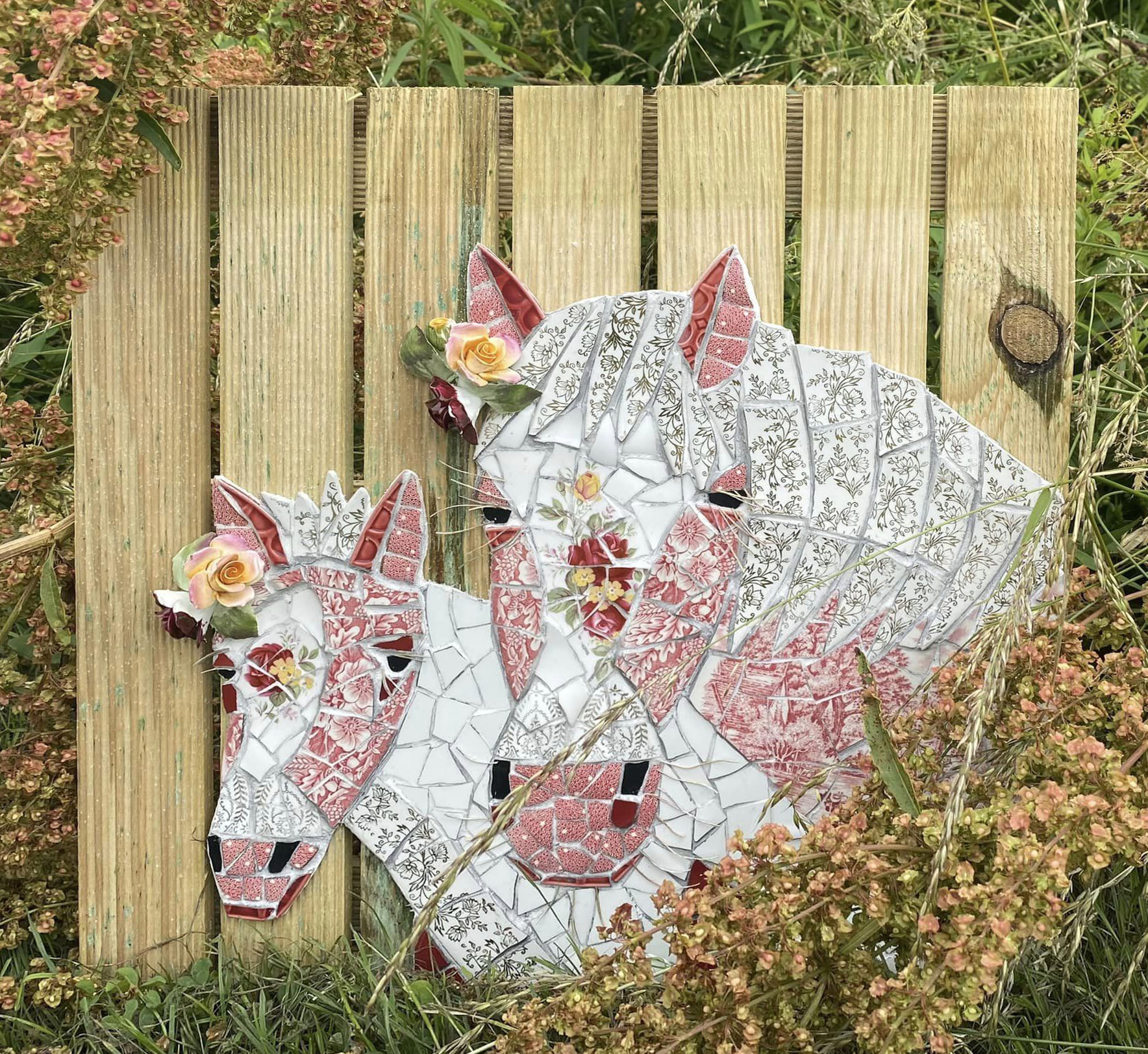 Mosaic artwork created with vintage crockery. 45cm x 45cm on untreated decking wood. Internal use only.